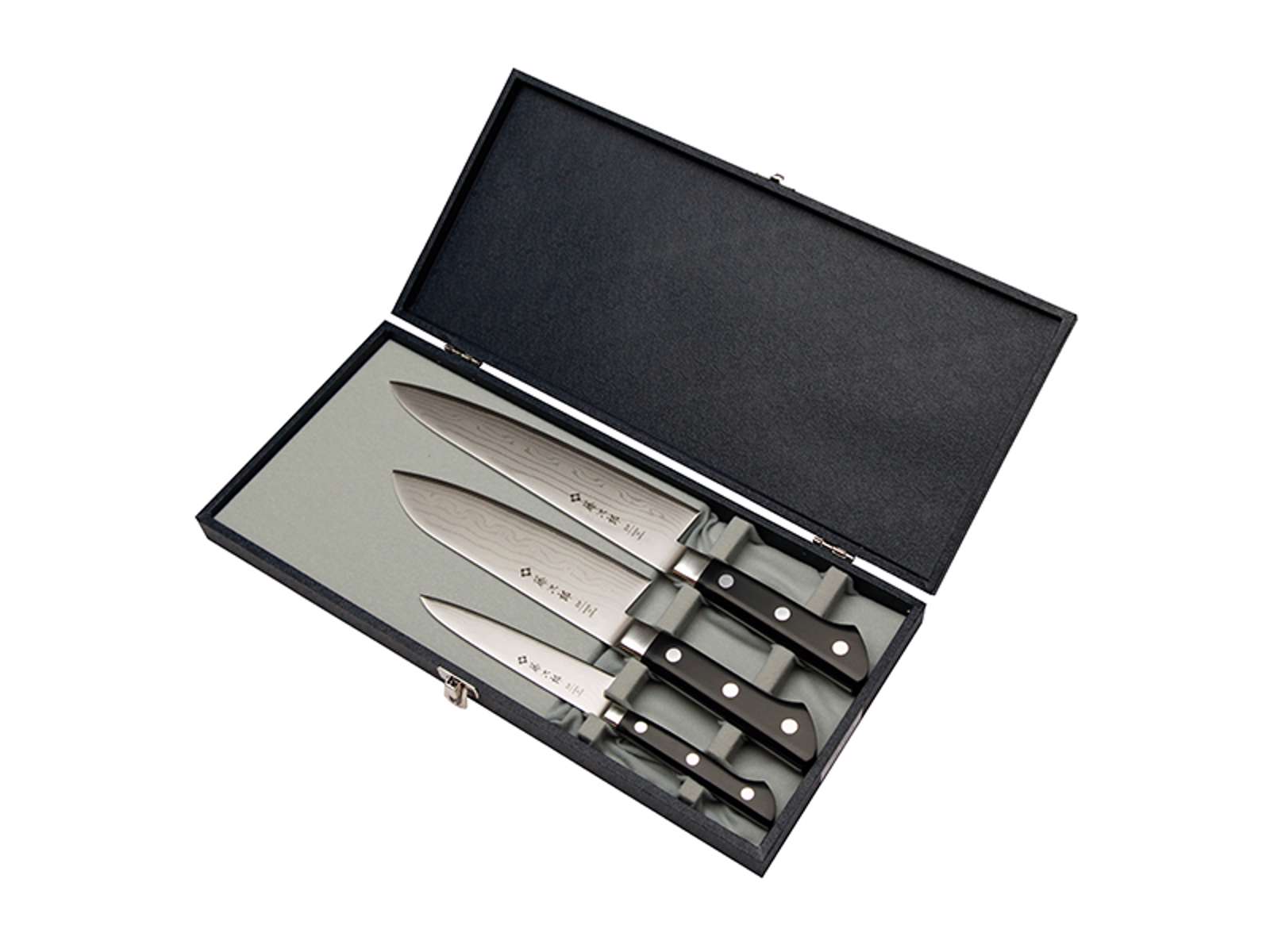 Sættet indeholder tre nøje udvalgte knive til forskellige køkkenopgaver: En 12 cm pyntekniv til detaljeret arbejde, en 17 cm Santoku-kokkekniv til grøntsager og mindre udskæringer, samt en 21 cm kokkekniv til større skæreopgaver. De 37 lag stål giver ikke blot knivene deres karakteristiske mønster, men bidrager også til deres styrke og skæreegenskaber. Knivene er fremstillet til professionelle standarder, hvor præcision og kvalitet går hånd i hånd.