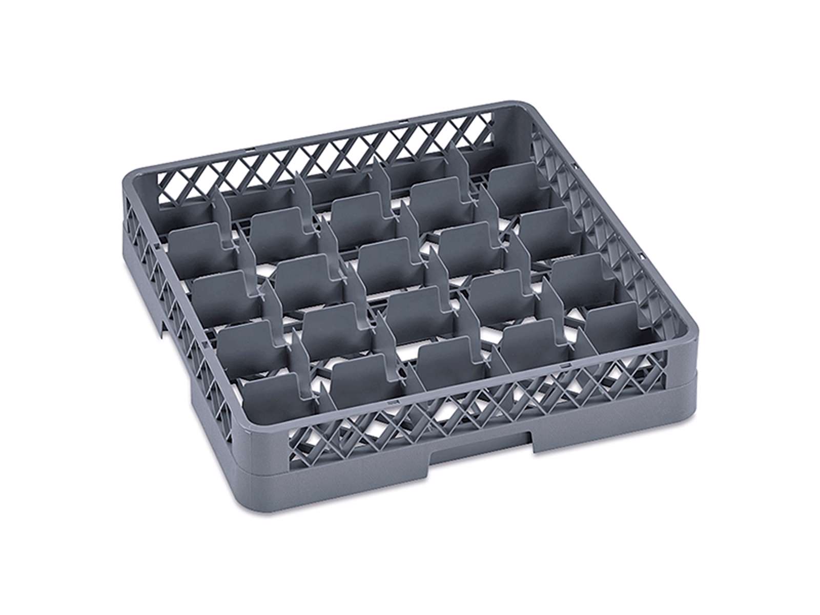 Fremstillet af slidstærk polypropylen, der tåler gentagen brug og høje temperaturer. Bakken måler 500x500x100 mm og har 25 rum på hver 9,2x9,2x9,2 cm, perfekt dimensioneret til standard drikkeglas. Den grå farve er praktisk i daglig brug og hjælper med at skjule mindre misfarvninger over tid.