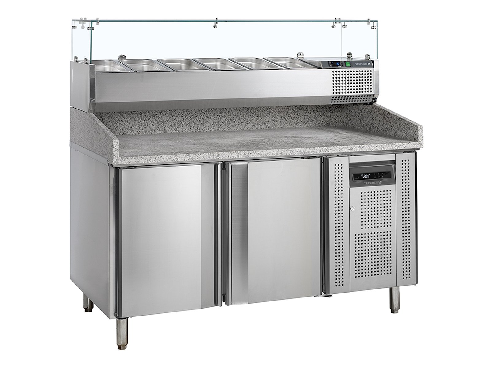 Granitbordpladen holder en naturligt lav temperatur, hvilket gør den perfekt til håndtering af dej uden at den klistrer. Under bordpladen finder du to selvlukkende døre med plads til 14 pizzaplader (400 x 600 mm), mens den ventilerede køling sikrer ensartet temperatur i hele skabet. Den indbyggede VK38-150 køleopsats med plads til seks GN1/3 kantiner giver hurtig adgang til dine friske ingredienser, hvilket reducerer bevægelser og sparer tid i travle perioder.