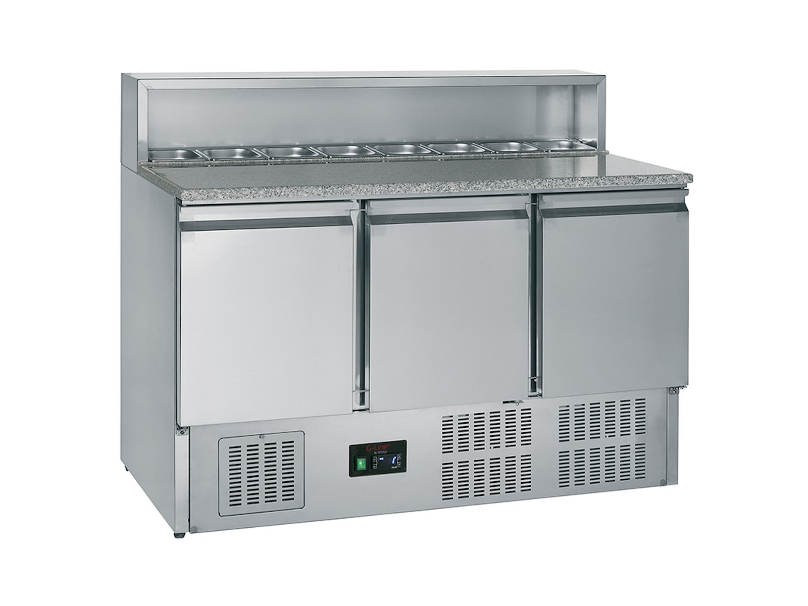 Granitpladen giver en naturligt kølig overflade, der forhindrer pizzadej i at klistre under udrulning. De tre låger under bordpladen giver hurtig adgang til ingredienser og redskaber, hvilket optimerer arbejdsgangen i travle køkkener. Den elektroniske termostat med ventilatorunderstøttet køling sikrer ensartet temperatur i hele enheden, så råvarer holdes friske og klar til brug.