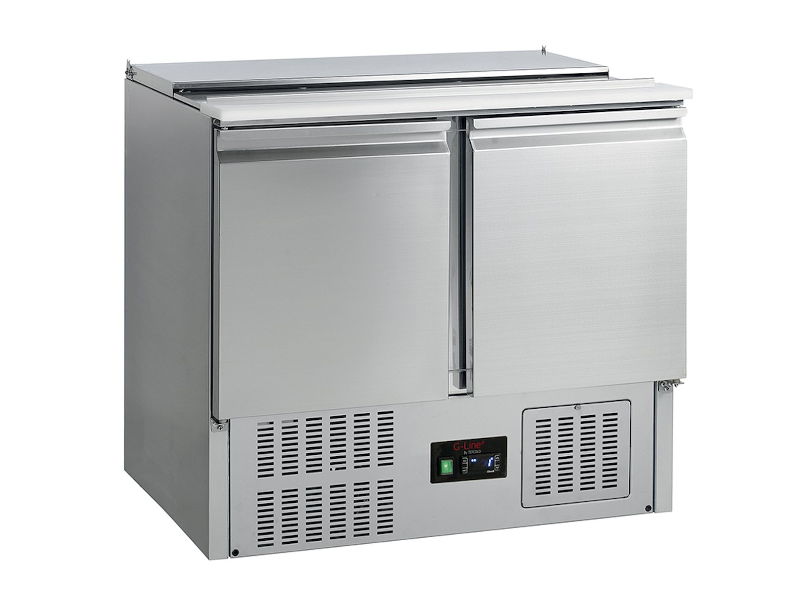 Den åbne top er forberedt til GN1/1-kantiner (medfølger ikke), hvilket giver dig frihed til at organisere salat, grønt og andre råvarer præcis som du ønsker. Det integrerede skærebræt foran beholderne skaber en praktisk arbejdsstation, hvor du kan tilberede ingredienser direkte ved køleenheden. De to låger med isoleret skumfyld og justerbare GN1/1-hylder giver fleksibel opbevaringsplads, så du kan tilpasse indretningen efter dine specifikke behov.