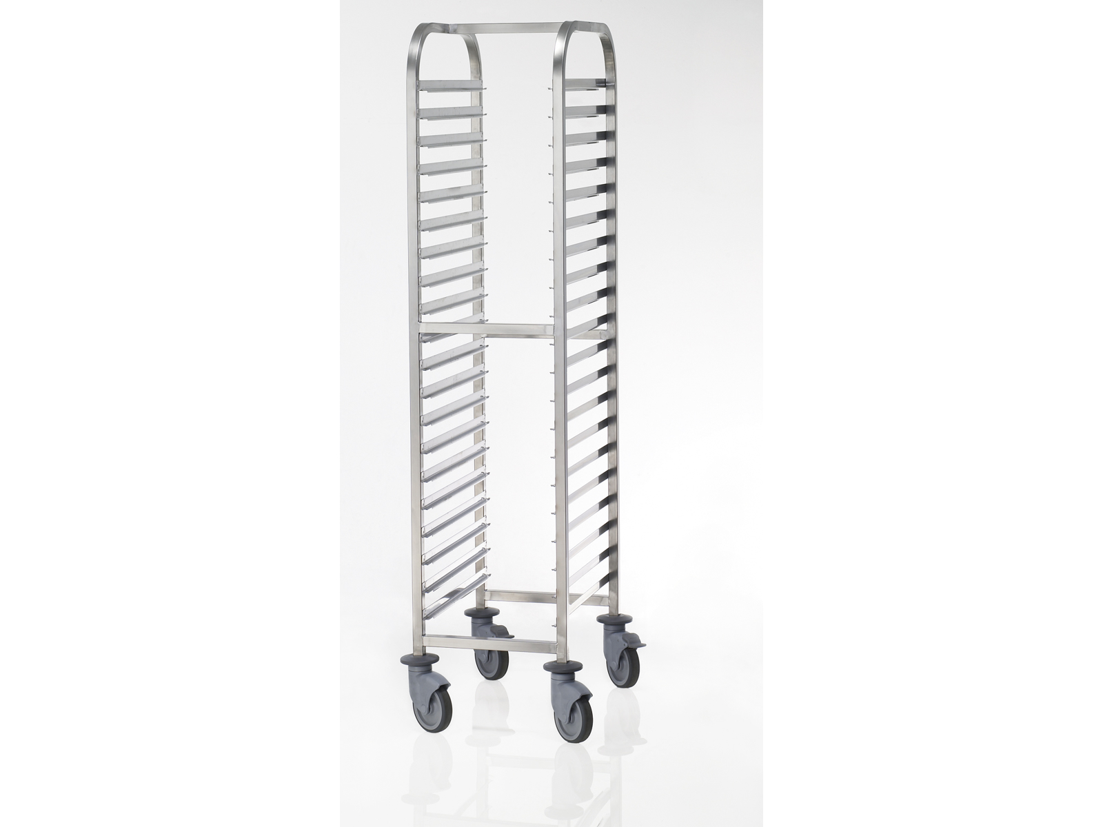 Med fire hjul på hver 12,5 cm i diameter bliver selv tung transport let og håndterbar. To af hjulene er udstyret med bremser, så vognen står stabilt, når den er parkeret. Hjulenes temperaturtoleranceområde fra -20°C til +60°C gør stikvognen anvendelig i forskellige køkkenområder - fra fryserum til varme produktionsområder. Med en kapacitet på op til 250 kg (maksimalt 20 kg per hylde) kan du transportere betydelige mængder mad og udstyr på én gang, hvilket reducerer antallet af ture og sparer værdifuld arbejdstid.