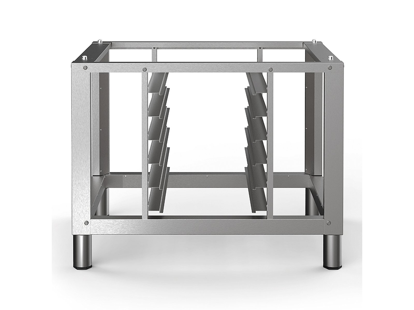 Understellet er konstrueret med 6 indstik, som passer til GN 1/1 bakker (600×400 mm), hvilket gør det nemt at opbevare bakker i nærheden af ovnen, klar til brug under produktion. Med en afstand på 80 mm mellem indstikkene er der plads til både standard bakker og forskellige køkkentilbehør.
