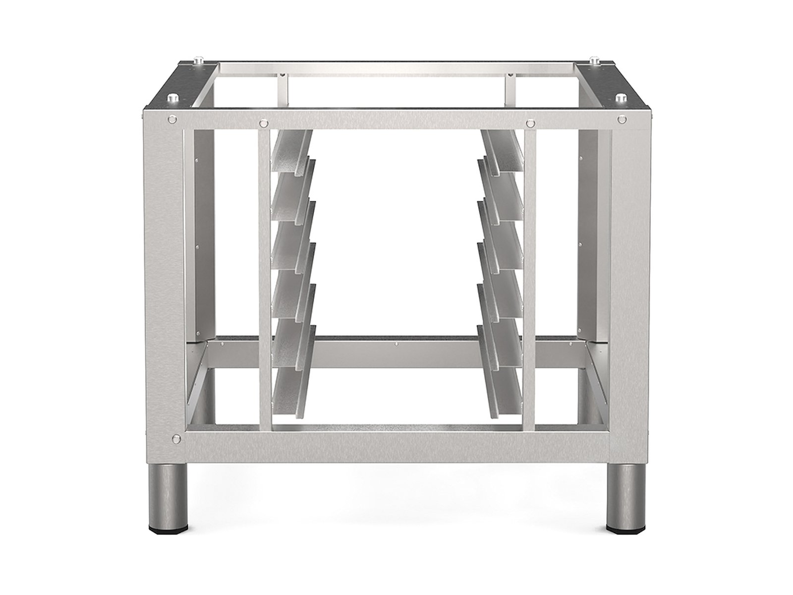 Understellet har 6 indstik med 80 mm afstand, som giver plads til GN 1/1 bakker (600 × 400 mm). Det gør det nemt at have bakker i nærheden af ovnen, klar til brug i produktionen, uden at fylde bordpladsen. Den robuste opbygning sikrer, at både ovn og bakker står stabilt og sikkert i daglig brug.