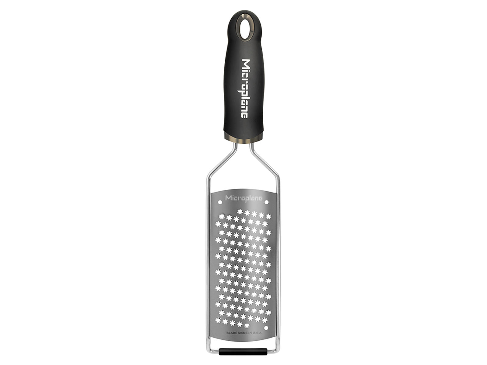 Dette stjernerivejern fra Microplane Gourmet-serien kombinerer funktionalitet og kvalitet i ét redskab. Med en bred riveflade på 13,3 x 6,7 cm og fotograverede blade af rustfrit stål i kirurgisk kvalitet sikrer dette rivejern en præcis og effektiv rivning. Det ergonomiske greb med blød overflade og den skridsikre bund gør arbejdet både behageligt og sikkert.