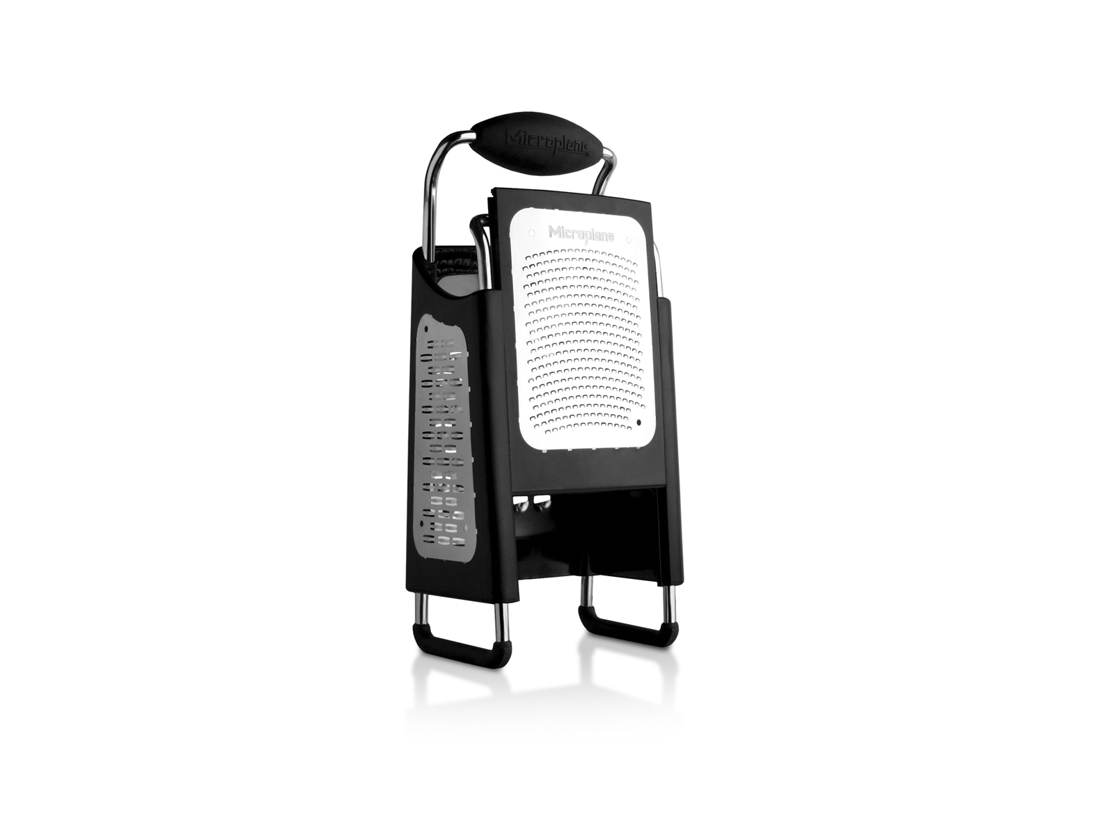 Dette Microplane råkostjern kombinerer fire forskellige rustfrie stålblade i ét praktisk køkkenredskab. Med ultra grove, fine og strimmelblade samt et skiveblad giver rivejernet dig mulighed for at tilberede alt fra coleslaw til fintrevet ost. De gummibeklædte fødder sikrer stabilitet under brug, mens det bløde greb giver komfortabel håndtering.