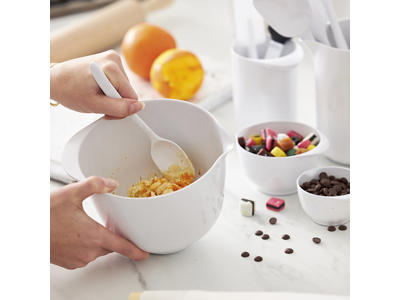 Det ergonomiske håndtag giver et sikkert og behageligt greb, så du nemt kan håndtere skålen, selv når den er fyldt. Den skridsikre silikonebund holder skålen stabil på køkkenbordet under kraftig omrøring, hvilket giver dig fuld kontrol over madlavningsprocessen. Skålens høje kant minimerer risikoen for spild, mens den hvide farve passer ind i ethvert køkkendesign.
