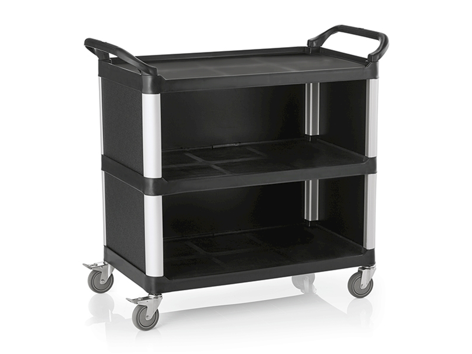 Rullebordet fra WAS har tre separate hylder i sort plast. Konstruktionen er optimeret til at give maksimal stabilitet samtidig med, at vægten holdes nede for at sikre nem håndtering. Hjulene er monteret, så de kan dreje frit i alle retninger, hvilket giver den bedste manøvredygtighed i trange områder.