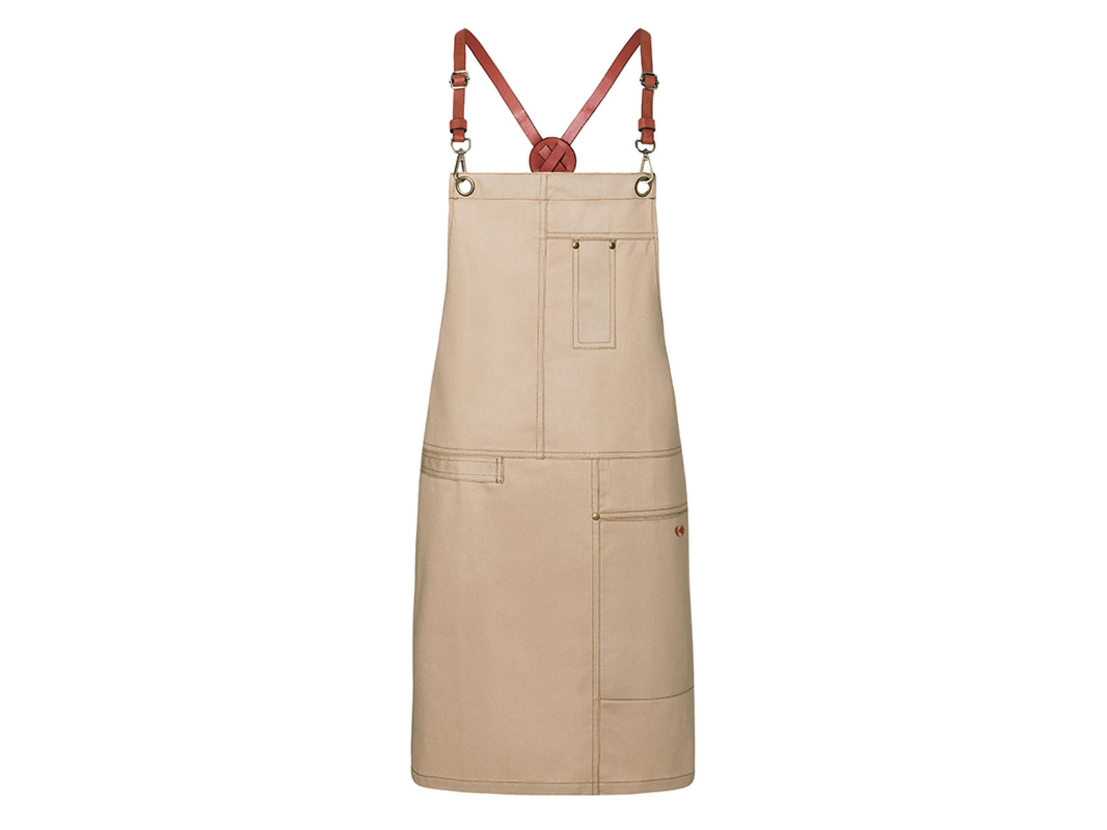 Dette sandfarvet forklæde med læderstrop fra Karlowsky kombinerer funktionalitet med rå æstetik. Med sine 68x80 cm dækker det effektivt arbejdsområdet, mens de aftagelige læderstropper giver et rustikt udtryk uden at gå på kompromis med komforten. Forklædet er fremstillet af 100% bomuld med en vægt på 273 g/m², hvilket sikrer en god holdbarhed i travle arbejdsmiljøer.
