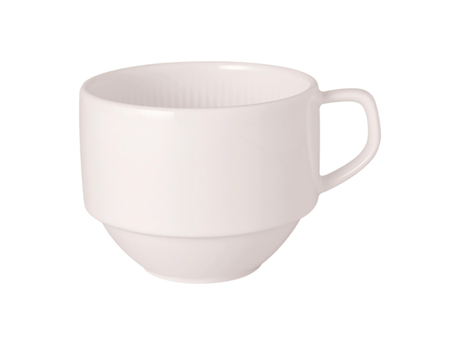 Denne stabelbare 150 ml kop fra Villeroy & Boch's Afina-kollektion er fremstillet af premium porcelæn i strålende hvid. Den karakteristiske svævende base og det fine reliefmønster giver koppen et sofistikeret udtryk, mens den praktiske stabelbarhed sparer plads i skabet.