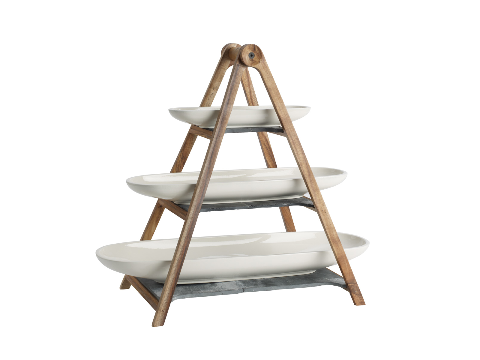 Den treetagede konstruktion maksimerer din serveringsplads uden at optage ekstra bordplads. Træets naturlige overflade skaber en varm kontrast til porcelæn og giver et rustikt, men elegant udtryk. Designet med flade kanter sikrer stabil placering af dine egne fade, tallerkener eller anretninger på hver etage.