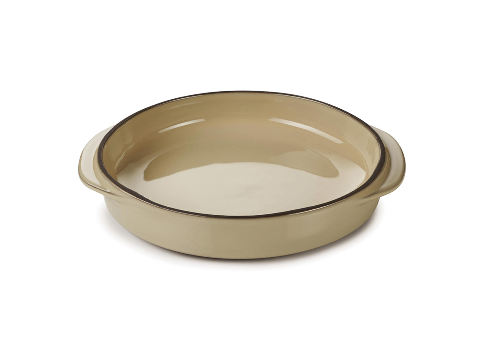 Hvert fad i Caractere-serien er unikt med sine cirkulære linjer og naturlige farvetoner. Den beige farve giver en varm, jordnær baggrund, der fremhæver madens farver og teksturer. Den rå lerkant og de diskrete variationer i glasuren fortæller historien om ægte håndværk og traditionelle fremstillingsmetoder, der giver dit bord karakter og dybde.