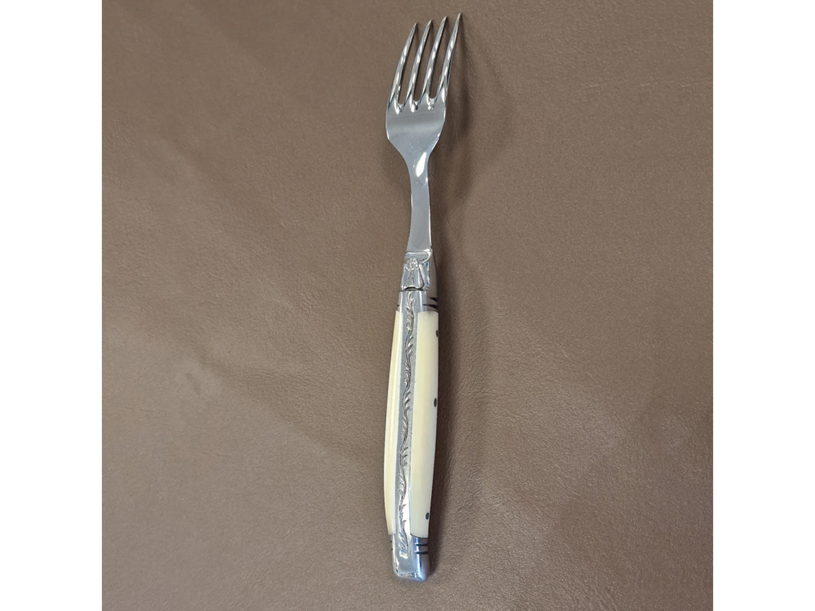 Denne Laguiole Prestige kagegaffel er fremstillet med et skaft af naturligt ben i hvid farve. Benets naturlige struktur gør hvert stykke unikt. Kagegaflen har en solid konstruktion, der sikrer holdbarhed gennem mange års brug. Den indgår i Prestige-serien fra Laguiole, kendt for sin høje kvalitet og håndværksmæssige finish.