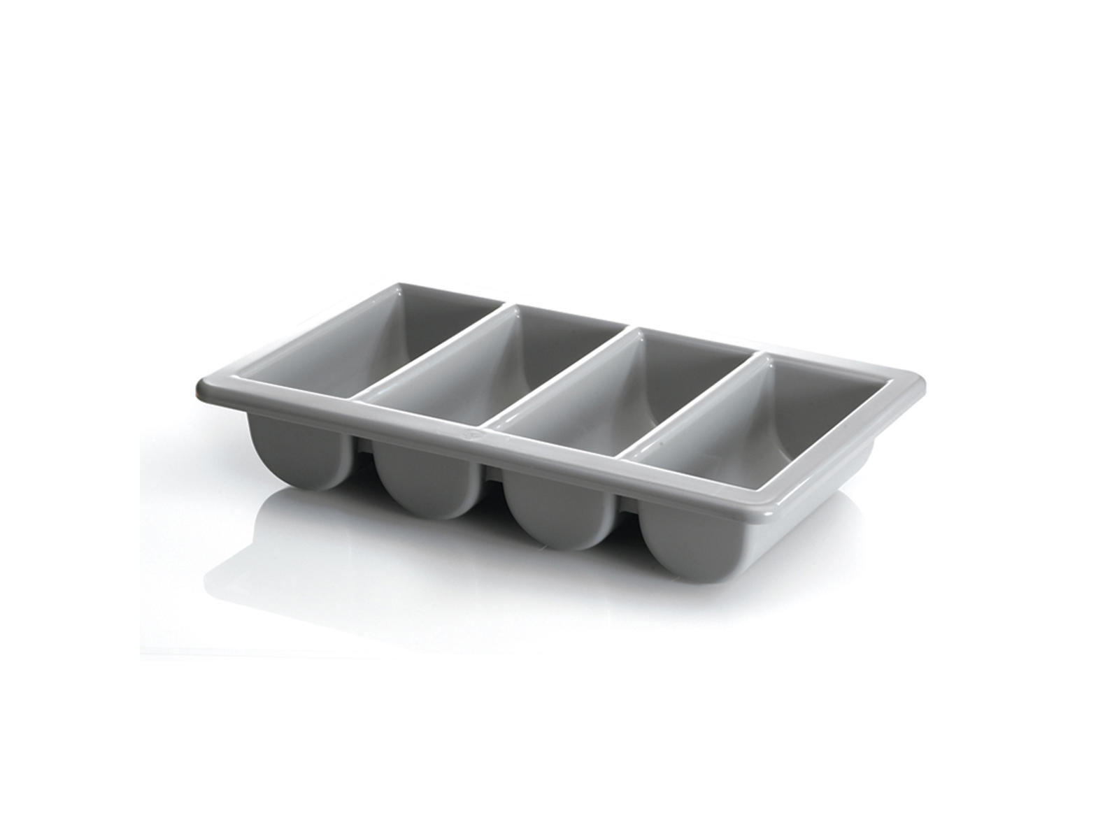 Bestikkassens fire separate rum giver mulighed for at holde forskellige typer bestik adskilt og organiseret. Dette reducerer håndteringstiden markant, da personalet ikke skal sortere bestik under travle serveringstider. Den grå farve er diskret og passer ind i alle køkkenmiljøer, mens den rektangulære form sikrer optimal udnyttelse af opbevaringsplads. Kassens standardiserede 1/1 GN-mål (53 cm lang) betyder, at den passer perfekt ind i eksisterende opbevaringssystemer i professionelle køkkener.