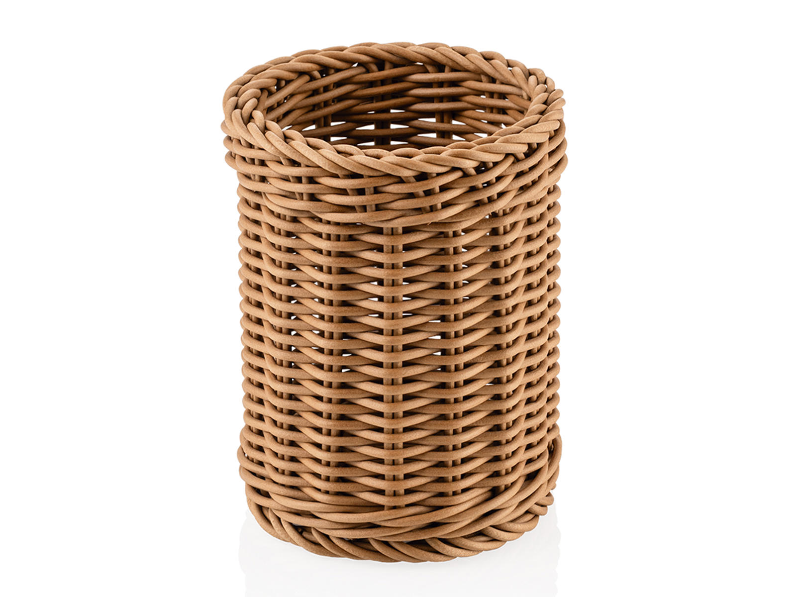 Denne brune Weaver Pro bestikkurv kombinerer funktionalitet med et stilfuldt flettet design. Med sine kompakte mål på Ø12 cm i diameter og 15 cm i højde giver kurven optimal opbevaringsplads til bestik på serveringsområder. Den robuste konstruktion sikrer holdbarhed i travle serveringsmiljøer.
