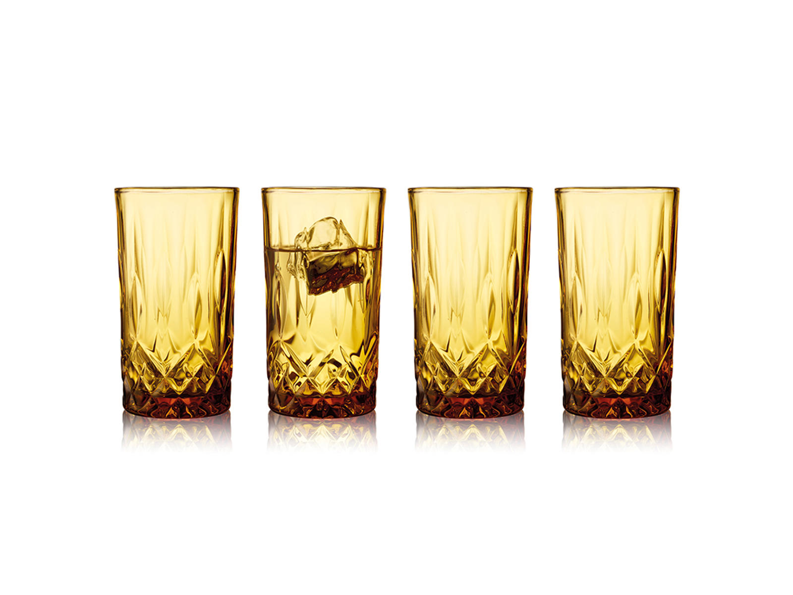 - Et sæt med 4 elegante highballglas i gennemfarvet ravfarvet glas
