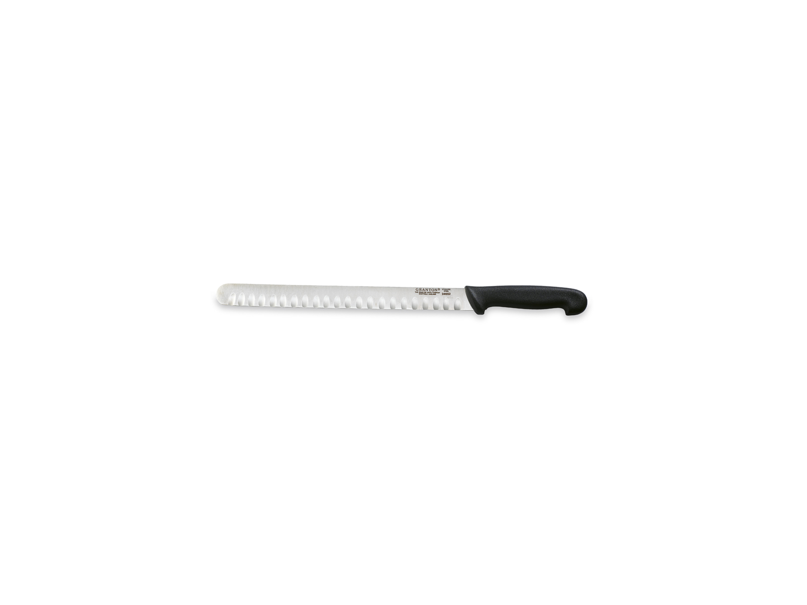 Denne 31 cm lange Granton skinkekniv er skabt til præcisionsskæring af skinke og andre charcuterivarer. Med sit lange, slanke blad i Sheffield-stål og de karakteristiske luftskær på begge sider af klingen sikrer kniven minimalt friktionsmodstand og maksimal kontrol. Det sorte polypropylenskæfte giver et sikkert greb under brug.