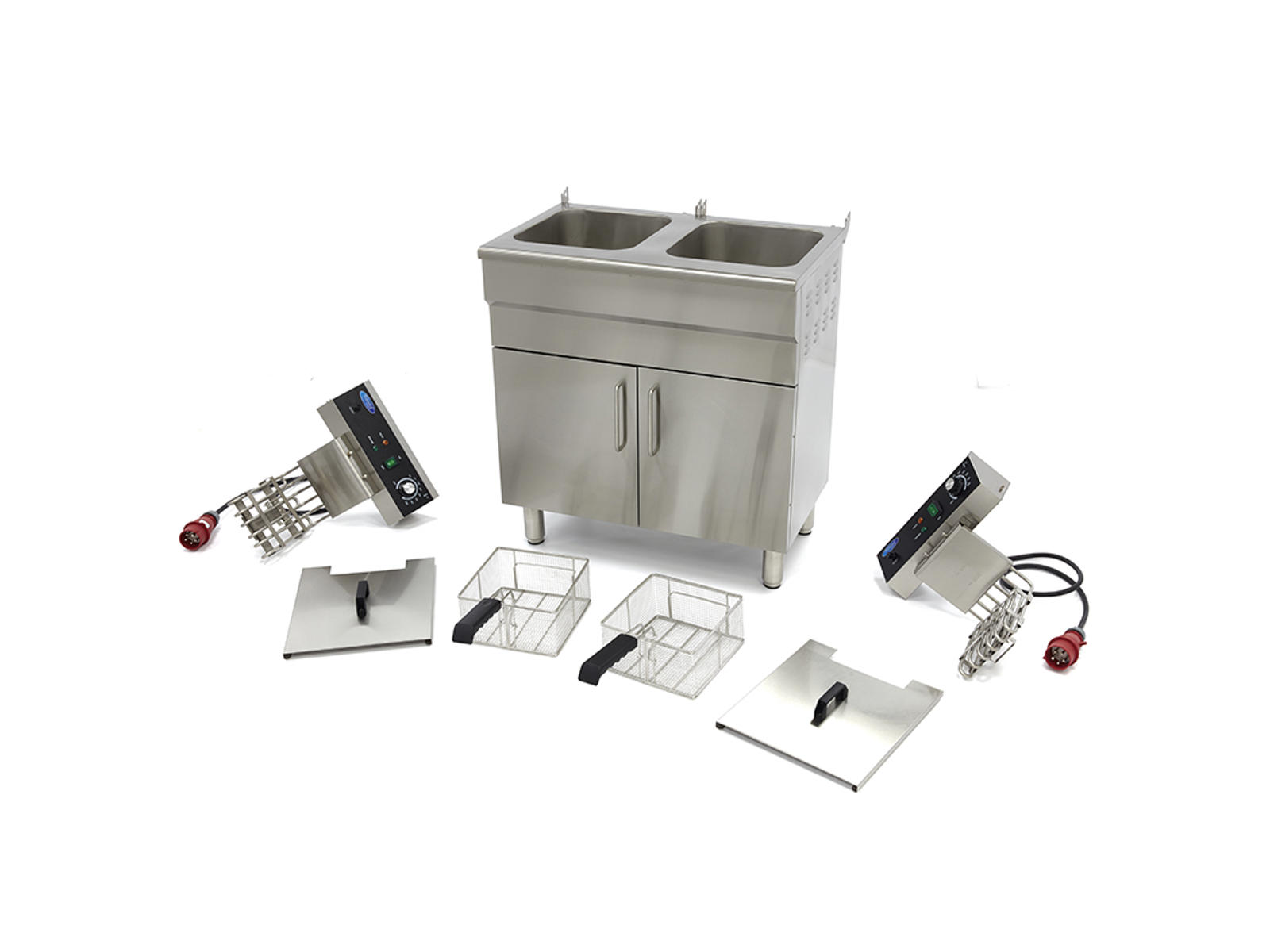 Med to separate 16-liters beholdere kan du stege forskellige madvarer samtidigt uden smagsoverførsel. Den kraftfulde 2 x 5000W varmekilde sikrer hurtig opvarmning og konstant temperatur selv ved intensiv brug. De fire stabile gummifødder holder frituregryden sikkert på plads, selv når du arbejder i et travlt køkkenmiljø. Den rustfri stålkonstruktion gør ikke kun rengøringen enkel, men sikrer også en hygiejnisk madlavningsproces, som lever op til professionelle standarder.