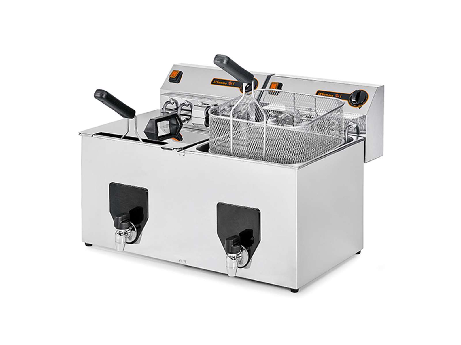 Fiamma TRV20 er en robust dobbeltfriture i rustfrit stål med to 10-liters kar, designet til professionelle køkkener. Den kombinerer præcis temperaturstyring fra 50-180°C med en produktionskapacitet på 20 kg i timen, hvilket gør den til et pålideligt redskab i travle køkkenmiljøer.