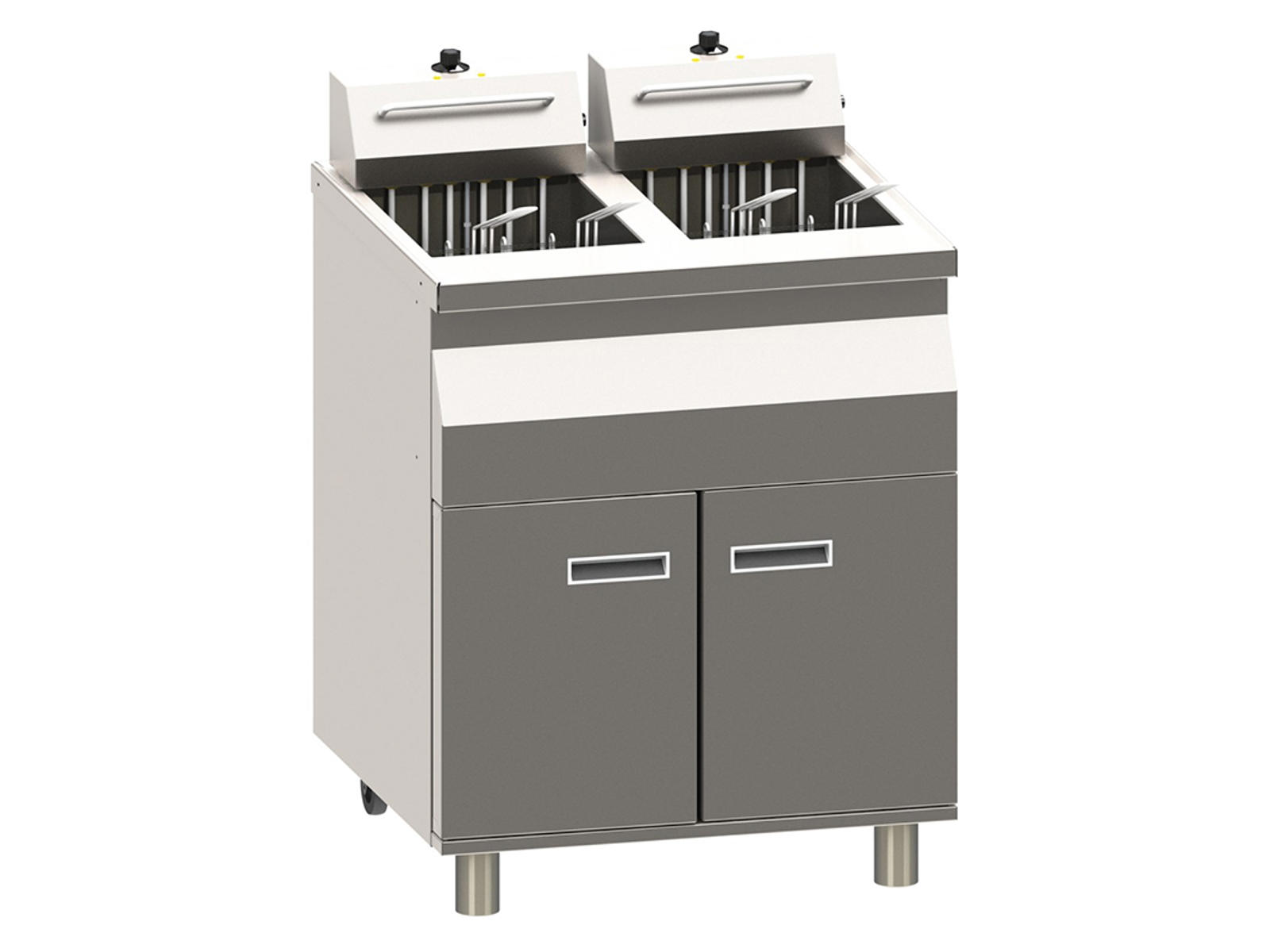 Denne professionelle gulvfriture fra FKI giver dig to 15-liters kar og 15 kW effekt til hurtig og præcis fritering. Den manuelle temperaturindstilling giver dig fuld kontrol over varmen, mens den robuste konstruktion sikrer lang holdbarhed selv i travle køkkenmiljøer. Brug det til at tilberede pommes frites, kylling, fisk og andre friterede retter med konsistente resultater hver gang.
