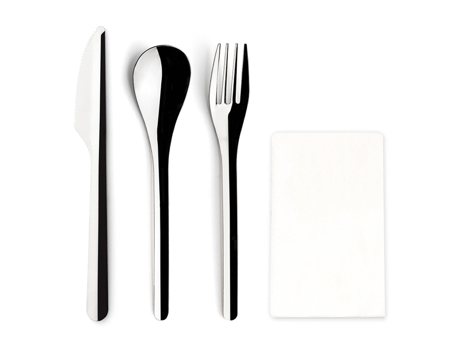 - Komplet sæt med kniv, gaffel, ske og serviet i én praktisk løsning