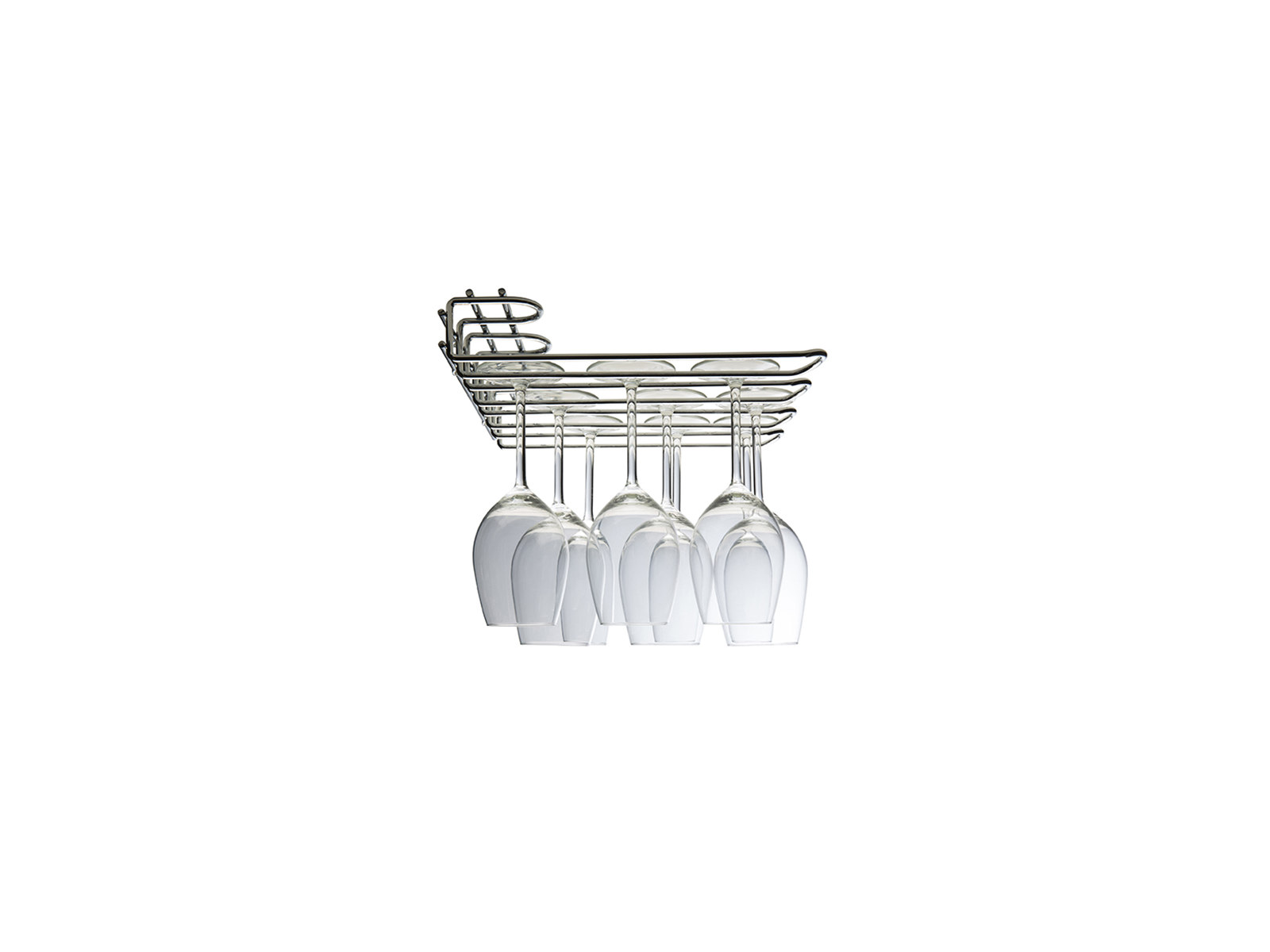 Dette glasophæng med 3 rækker giver en praktisk og sikker løsning til opbevaring af glas i dit køkken eller serveringsområde. Konstrueret i holdbart rustfrit stål med dimensionerne 650x530x200mm sikrer ophænget optimal udnyttelse af pladsen, samtidig med at glassene er let tilgængelige.