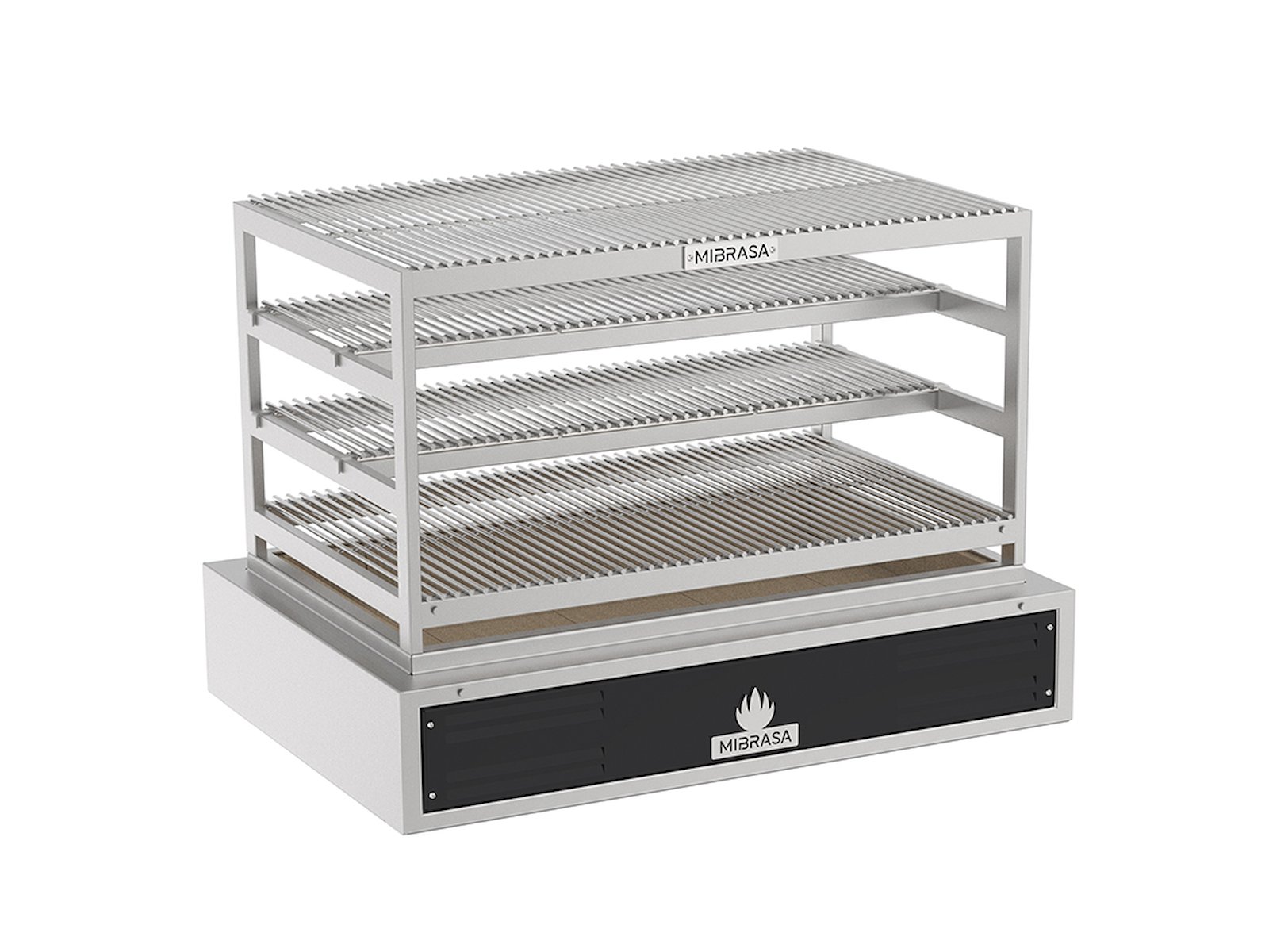 Mibrasa RM100 Robata Beast er en professionel kulgrill i rustfrit stål designet til restauranter med åbne køkkener. Med fire faste niveauer og aftagelige grillflader giver den maksimal fleksibilitet ved tilberedning af forskellige råvarer samtidig. Den ildfaste bund med murstensforing sikrer optimal varmefordeling.