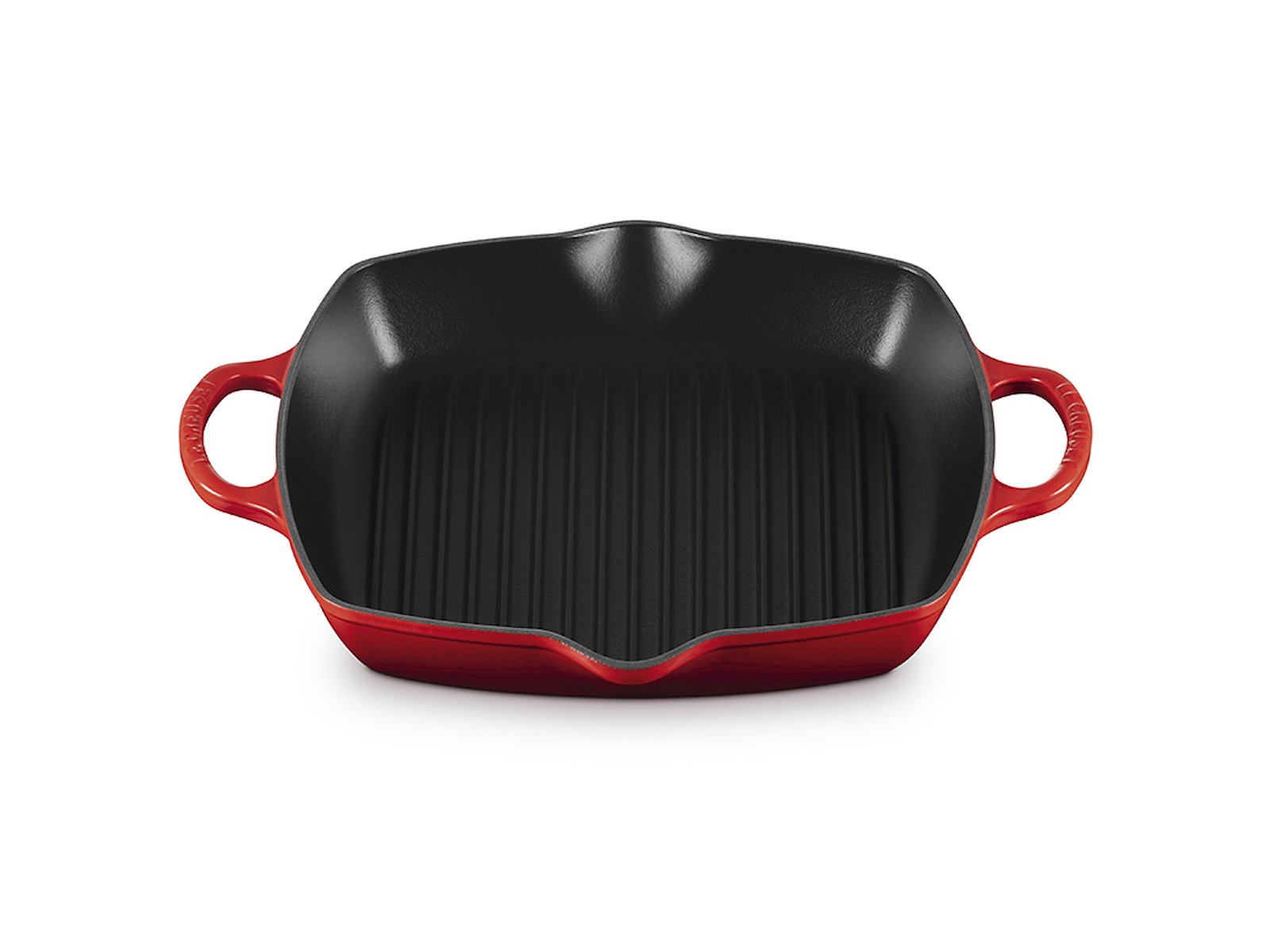 Grillpanden i den ikoniske Cerise-røde farve måler 30x30 cm og vejer 3,8 kg. For at bevare pandens kvaliteter anbefales håndvask med varmt vand, selvom den tåler opvaskemaskine. Ved at undgå kraftige rengøringsmidler bevarer du den naturlige patina, som forbedres med tiden og giver bedre madlavningsresultater. Panden er fryseegnet og kan bruges ved temperaturer fra -23°C til 350°C.
