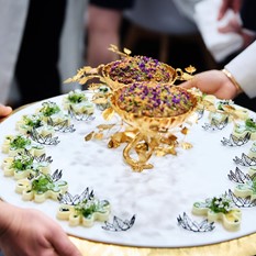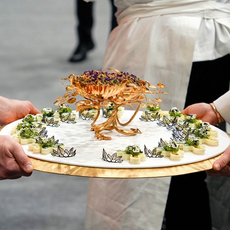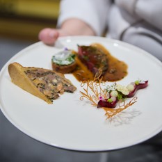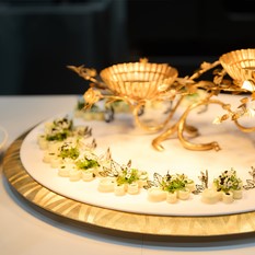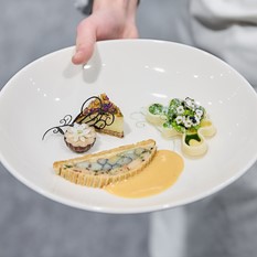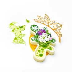 I Danmarks blomstrende skove, hvor enebær og vilde urter tæpper jorden, vandrer hjorte rundt i naturens buket. Vores platte fortæller denne historie gennem mørt kød og foie gras, forstærket af aromatiske urter og blomstrende te. Fra brændt enebær til citrusblomster, hvert element fanger essensen af vores skovflora. Pære og solbær taler om frugttræer i blomst, mens ældre ost og syltede grøntsager bevarer sommerens blomster Bounty.