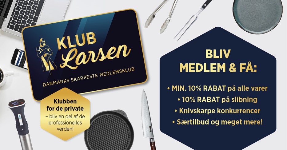Klub Larsen er vores medlemsklub for private kunder, der ønsker den gode kvalitet til ekstra stærke priser, ekstra gode tilbud og masser af herlig information.Som medlem af Klub Larsen får du nyhedsmails med tilbud, konkurrencer, tips og idéer. Og du deltager automatisk i vores vilde konkurrencer.