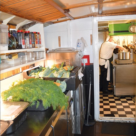 Menuen byder på klassikere som fish&chips, men leger også med lokale råvarer på nye måder. Sådan er det på et skib: Man søger nye horisonter og glæder sig til at komme hjem. Én kurs er sikker, og den handler om god stemning ombord og respekt for råvarer, hav og jord.