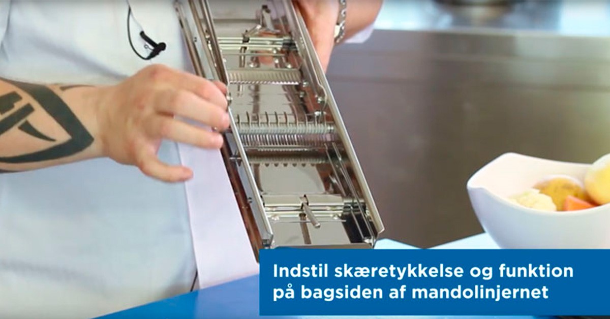 Mandolinjernet er helt fantastisk til at snitte papirtynde kartofler til hjemmelavede chips og fine stave til gulerødder. Blandt andet. I denne video kan du lære, hvordan du gør. Indstil først skæretykkelse og funktion på bagsiden af mandolinjernet. Fold så mandolinjernet ud og tjek at det står forsvarligt fast. Når det er gjort, monterer du dine grøntsager på slædens nåle og presser det hele mod kniven. God mad kræver godt grej – og mandolinjernet er uundværligt i dit køkken.