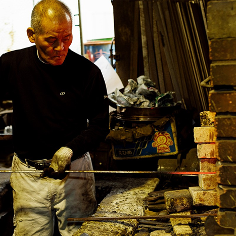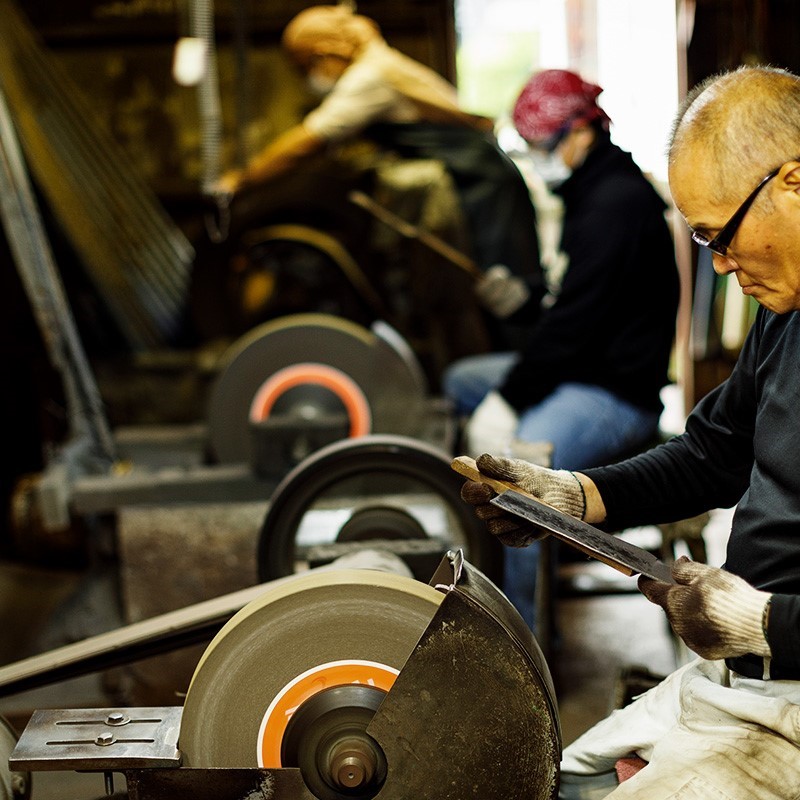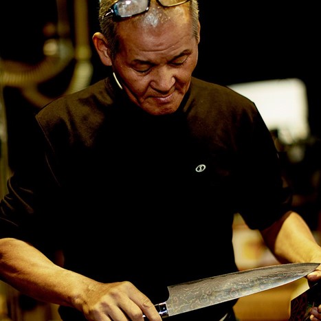 Echizen-smed, Takeshi Saji er blandt de førende knivmagere i Takefu City, og anerkendt for sine unikke køkkenknive, skabt på baggrund af et genialt idegrundlag og traditionelle forarbejdningsmetoder.