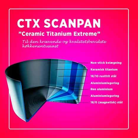 Indvendigt er den beklædt med keramisk titanium, der opvarmes til 20.000 grader, før bearbejdningen foretages. Endelig kommer den slip-let venlige PTFE-overflade. Disse pander er udviklet til den krævende og kvalitetsbevidste kok.