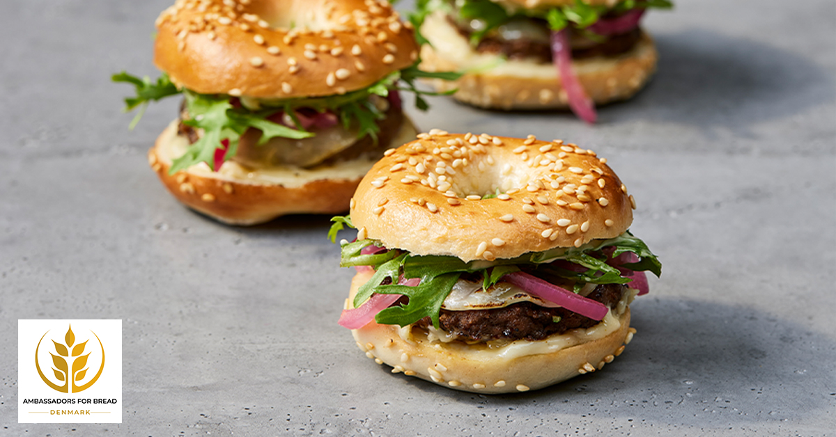 Varm minibagel m. krydret bøf, vesterhavsost, syltet rødløg og Frisée salat