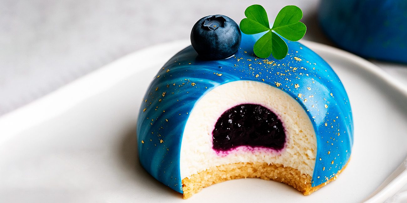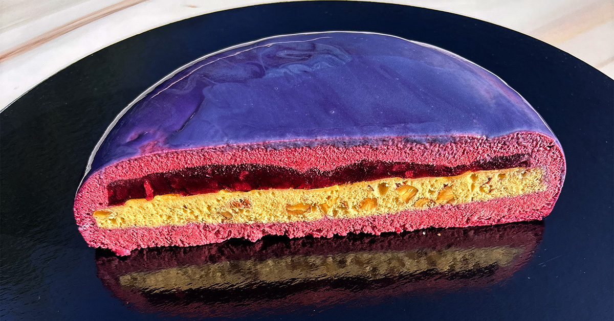 Fragilité med mandler, brombærcreme og syltede blåbær