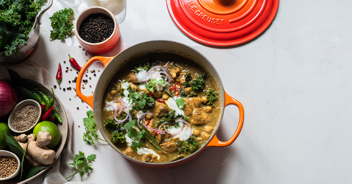 Hjemmelavet karrygryde med kylling, grønkål og kikærter