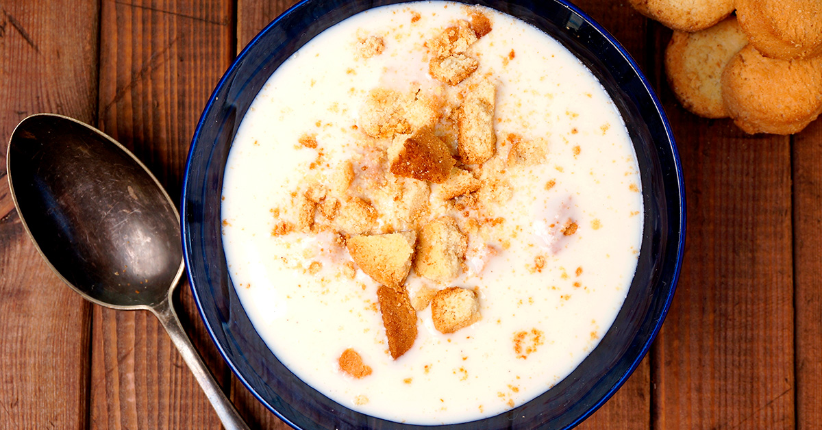 Koldskål med grillet jordbær og karamelliserede valnødder