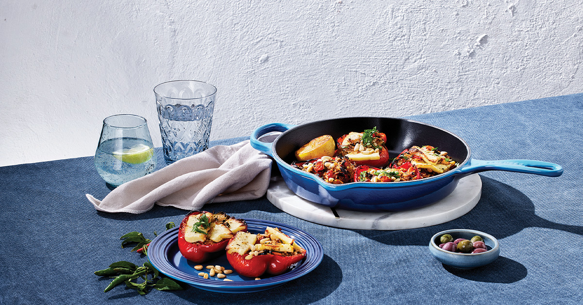 Fyldte peberfrugter med ris pilau og grillet halloumi