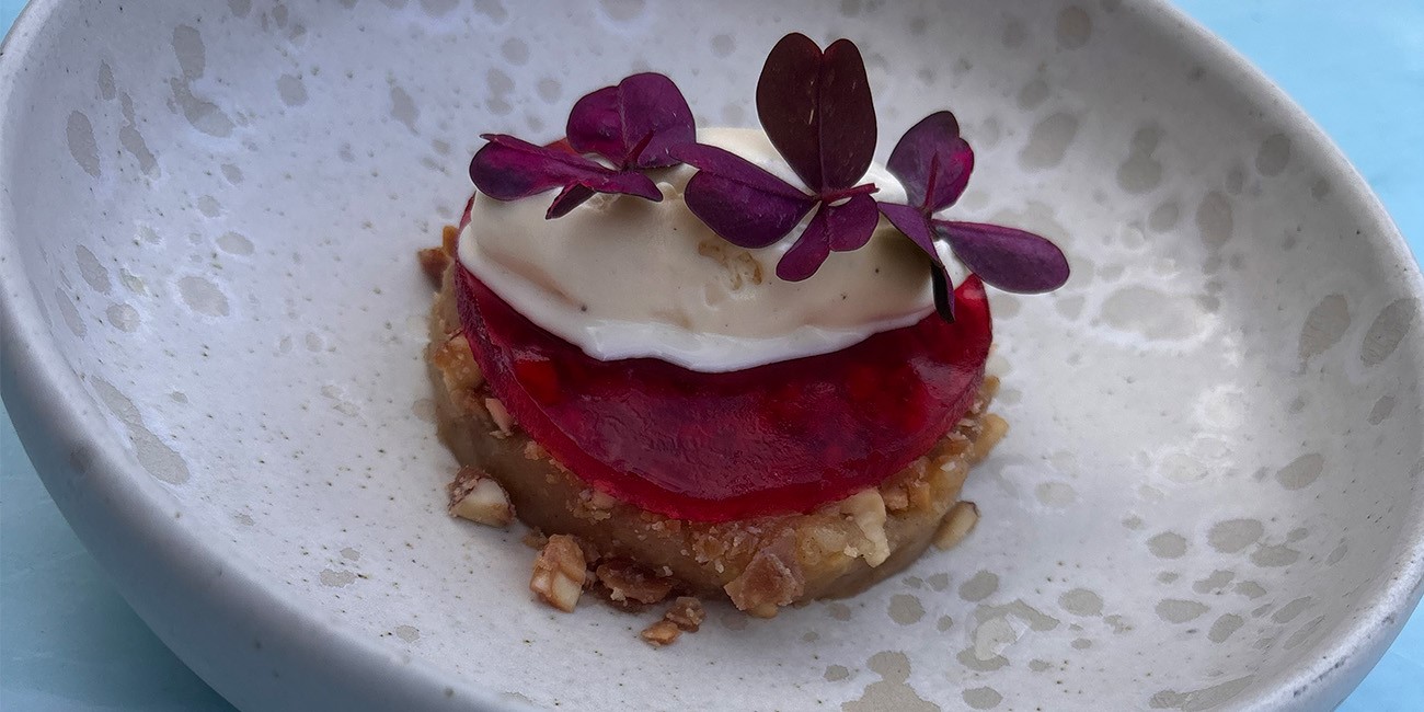 Denne dessert er en udsøgt kombination af smag og teksturer, bestående af en cremet is med delikate noter af olivenolie. Isen komplementeres perfekt af en hjemmelavet æblekompot, krydret med varm kanel, hvilket tilføjer en hyggelig og aromatisk dybde. For at skabe kontrast toppes desserten med en sprød nøddeknas. Til sidst tilføjes en ribsgelé, som bidrager med en frisk og let syrlig note, der afbalancerer sødmen og fuldender denne elegante dessert – med inspiration fra den klassiske gammeldags æblekage.