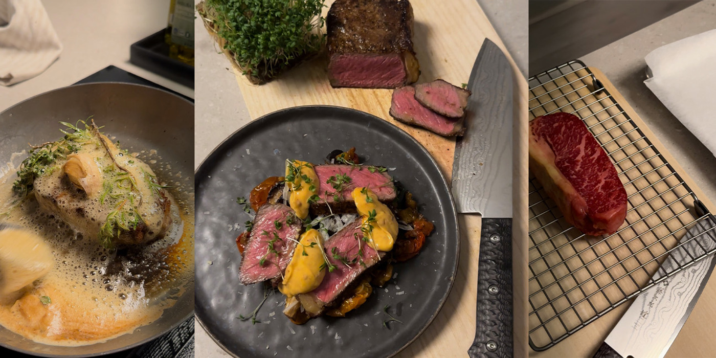 - Øs kødet med det smeltede smør i et minuts tid, flyt derefter entrecôten til en bageplade og steg færdig i ovnen ved 120–130 °C til en kernetemperatur på 54 °C. Lad kødet hvile i 10 minutter før udskæring.