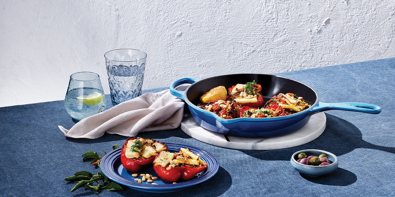 Læg peberfrugterne i et ovnfast fad eller støbejernspande (ca. 26 cm). Dryp med resten af olivenolien, drys med salt og peber, og fyld dem med risblandingen.