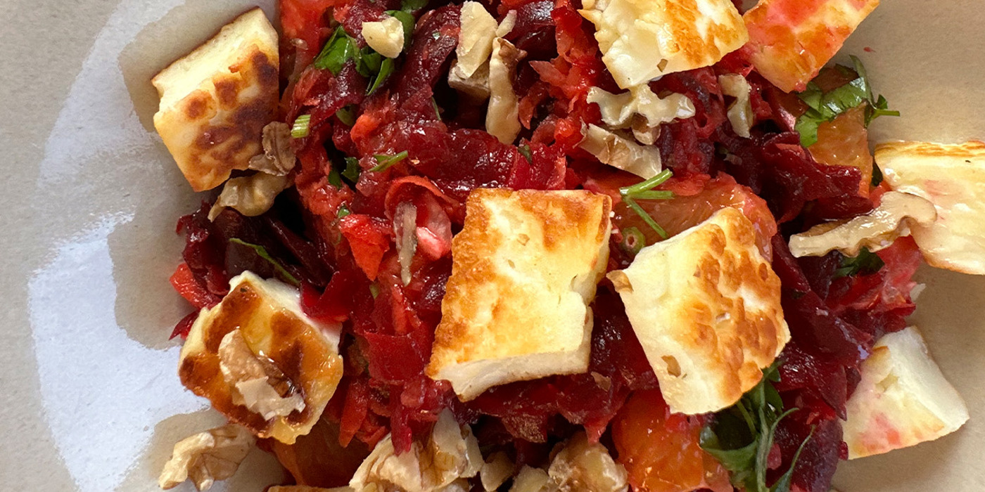 Fyldt med farver og sprødhed kombinerer denne salat søde rødbeder, saftig appelsin og sprødstegt halloumi. Toppet med ristede valnødder og en frisk appelsindressing er den både frisk, smagfuld og mættende.