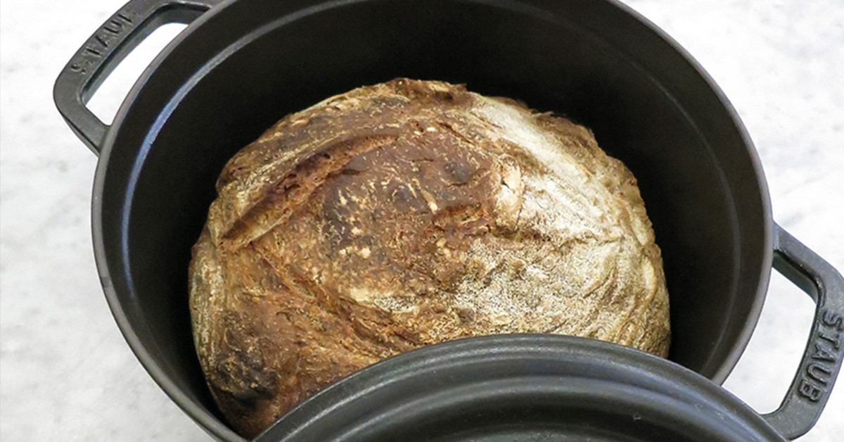 Du får nemlig et rigtig flot brød ved at bage det ved høj varme i en støbejernsgryde.