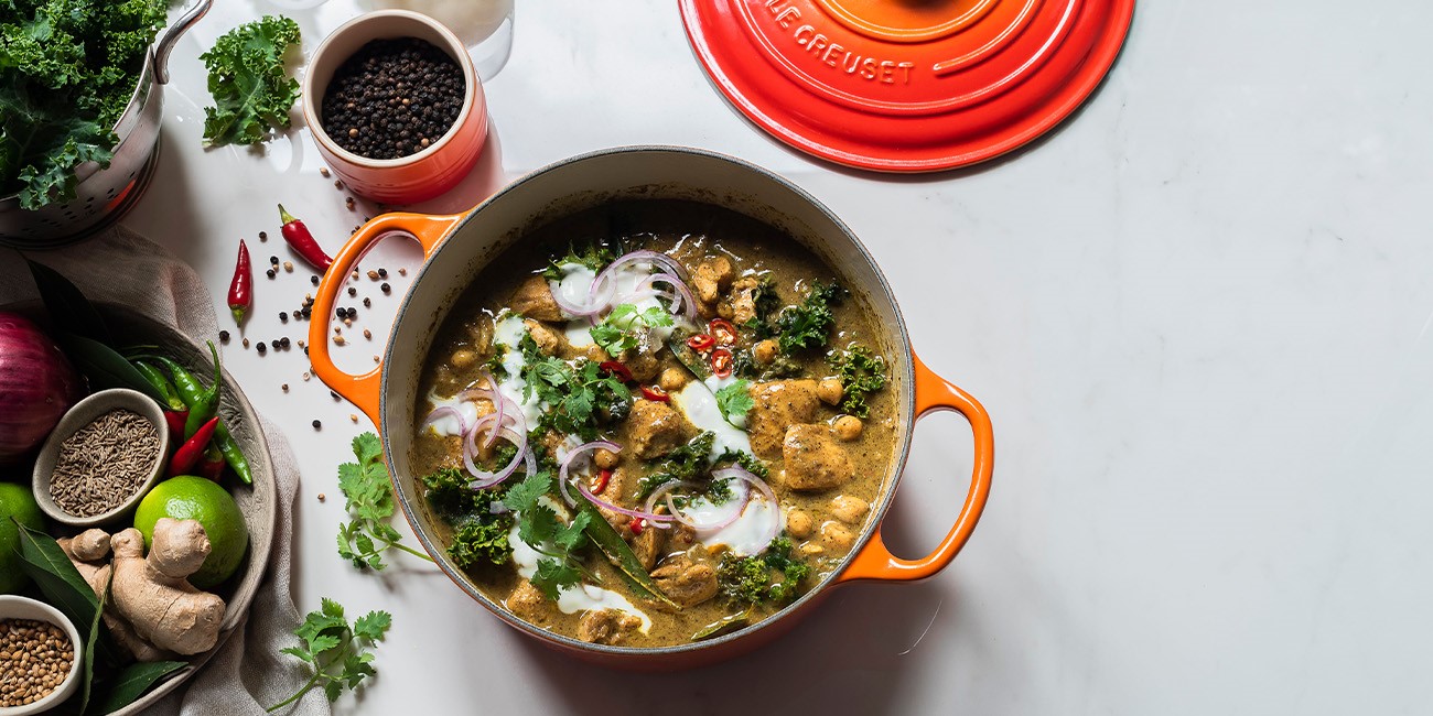 Tag hul på en smagsoplevelse, hvor varme krydderier med sødme fra kokos og syrlige limegraf vågner til live i din gryde. I denne karrygryde mødes mør kylling, proteinrige kikærter og grønkål i skøn harmoni, simret til perfektion i din støbejernsgryde. En opfriskende ret – klar på under en time – der både tilfredsstiller og varmer fra første mundfuld