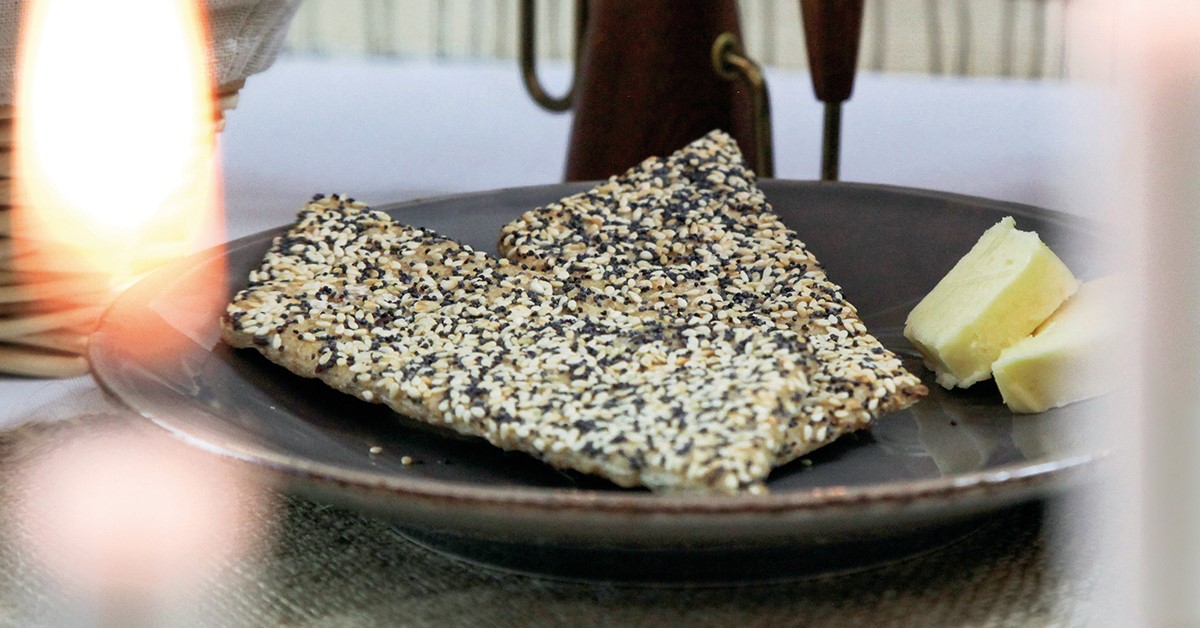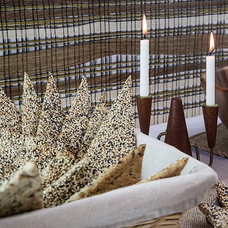 - Knækbrøddene prikkes, stryges med vand, og drysses derefter med sesamfrø og blå birkes.