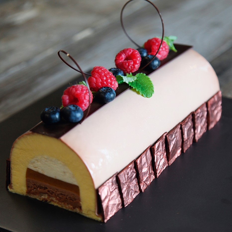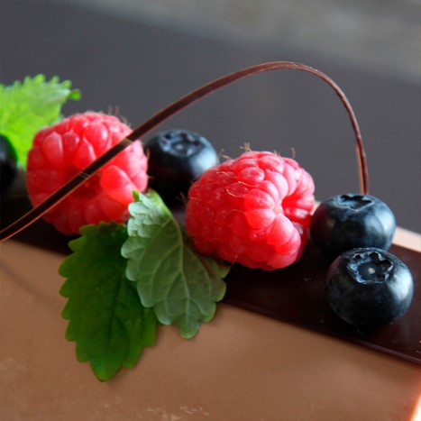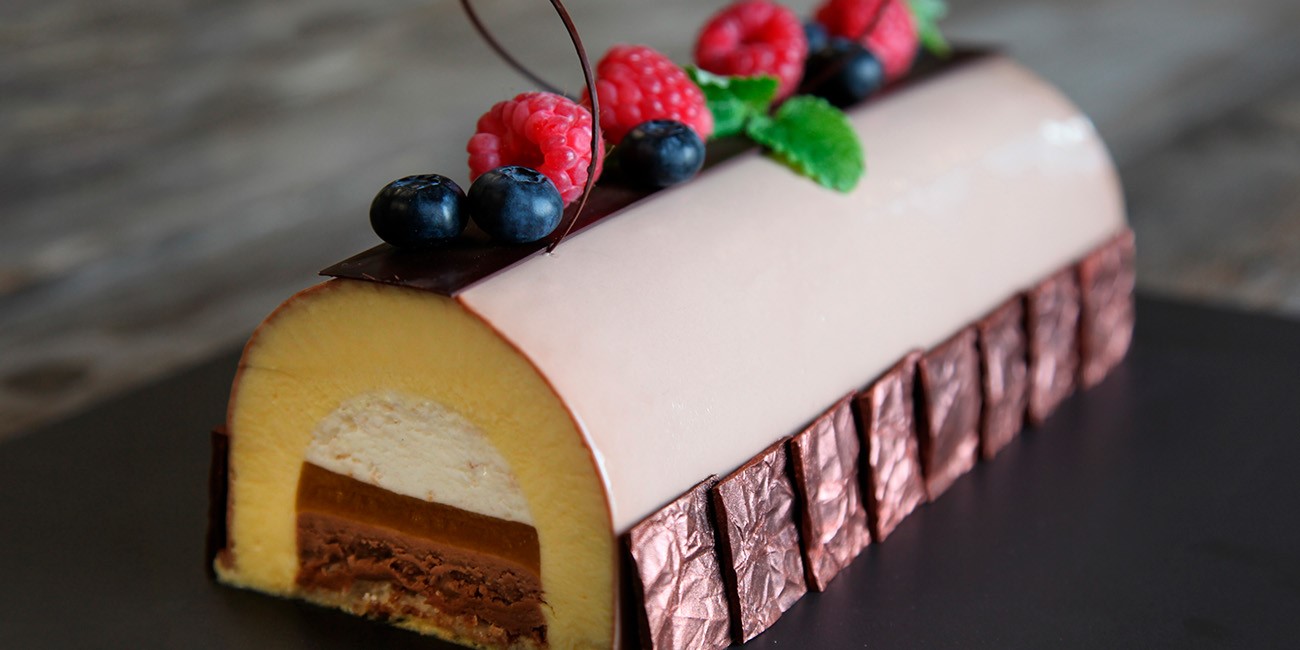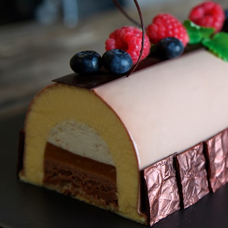 - I en større silikoneform (Sublime 250x80 mm / varenummer 8KE021), fyldes 460 g passionsmousse.