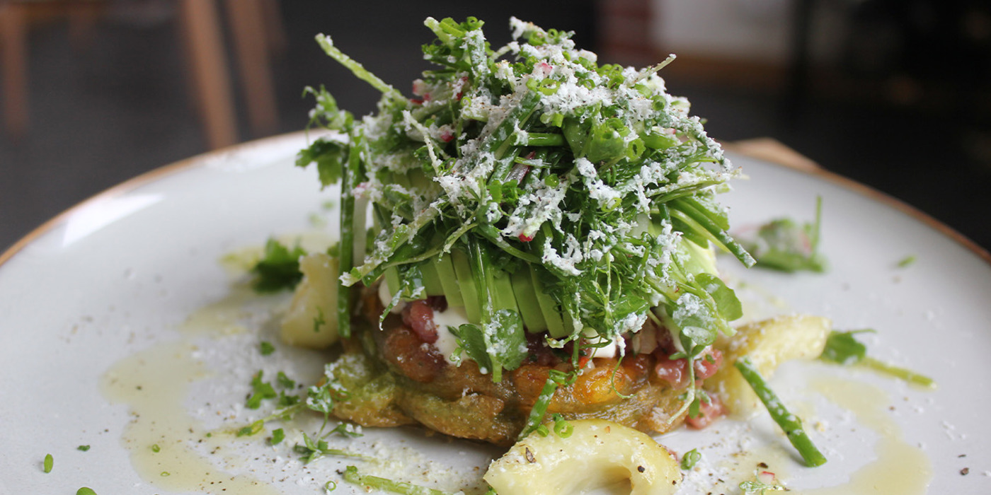 Sprøde, gyldne majsfritter med en uimodståelig knas, toppet med silkeblød råbiff vendt i citron og olivenolie. Dertil cremet cremefraiche, moden avocado og en frisk, sprød urtesalat med syrlig, let picklet agurk. Som prikken over i’et – et snefald af salt feta, der smelter let mod de lune fritter.