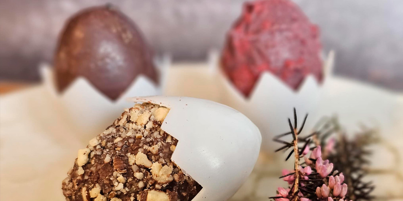 - Læg et lille stykke nougat i midten og form marcipanen til et æg.