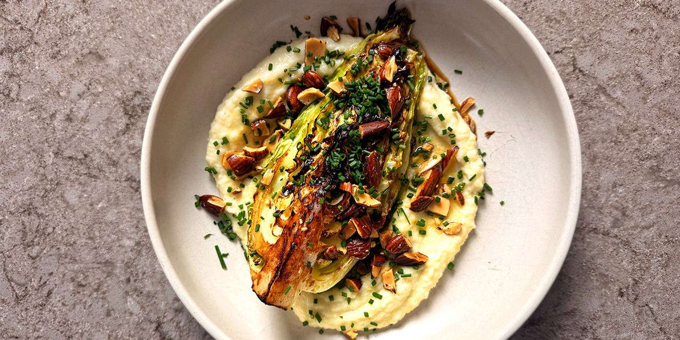 Miso-ristet spidskål på jordskokkepuré med brunet smør og ristede mandler